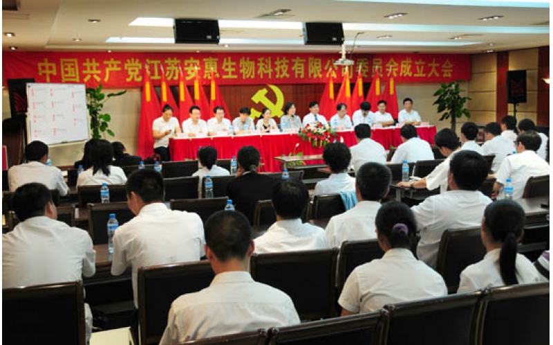 2009年6月30日,中國共產(chǎn)黨江蘇安惠生物科技有限公司委員會成立。開發(fā)區(qū)黨工委副書記、管委會副主任嚴憲,“兩新”工委書記、組織部副部長邵平,紀工委副書記王艷青等出席成立大會。